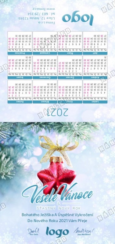 Toto vánoční přání je skládací ve formě karty s kalendářem a úpravou pro přeložení k postavení na stůl jako "Áčko". Přání je do obálky DL. Námi vyráběné novoročenky a vánoční přání jsou tištěny na kvalitním 300g křídovém papíře.