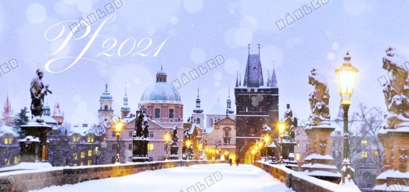 Novoročenka z večerní Prahy na zasněženém Karlově mostě
